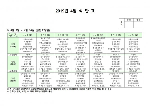 4월 둘째주 식단표 페이지 정보 작성자 은천노인복지회 작성일19-04-16 09:48 조회195,972회 댓글0건 관련링크 이전글 다음글 목록 답변 본문 4월 둘째주 식단표 이전글 다음글 목록 답변
