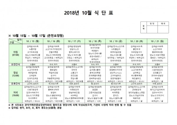 10월 셋째주 식단표 페이지 정보 작성자 은천노인복지회 작성일18-10-30 09:48 조회196,434회 댓글0건 관련링크 이전글 다음글 목록 답변 본문 10월 셋째주 식단표 이전글 다음글 목록 답변