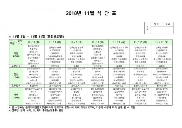 11월 1주째 식단표 페이지 정보 작성자 은천노인복지회 작성일18-12-07 09:37 조회198,403회 댓글0건 관련링크 이전글 다음글 목록 답변 본문 11월 1주째 식단표 이전글 다음글 목록 답변