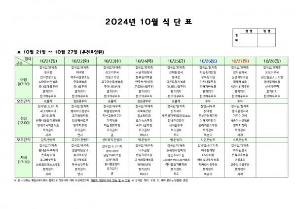 10월 넷째주 식단표 페이지 정보 작성자 은천노인복지회 작성일24-10-18 10:37 조회13,168회 댓글0건 관련링크 이전글 다음글 목록 답변 본문 . 이전글 다음글 목록 답변