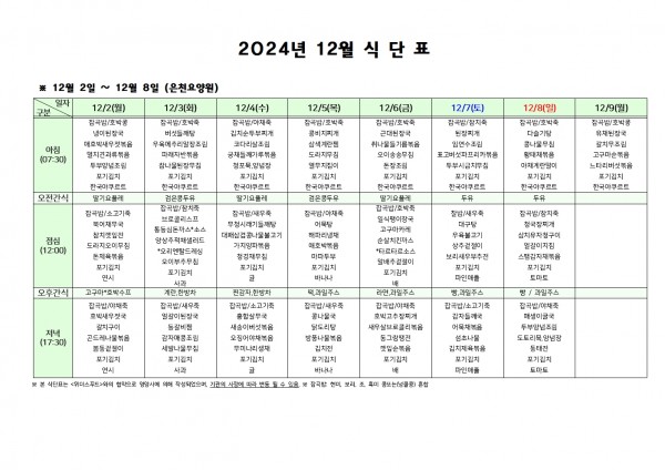 12월 첫째주 식단표 페이지 정보 작성자 은천노인복지회 작성일24-11-29 16:53 조회12,216회 댓글0건 관련링크 이전글 다음글 목록 답변 본문 . 이전글 다음글 목록 답변