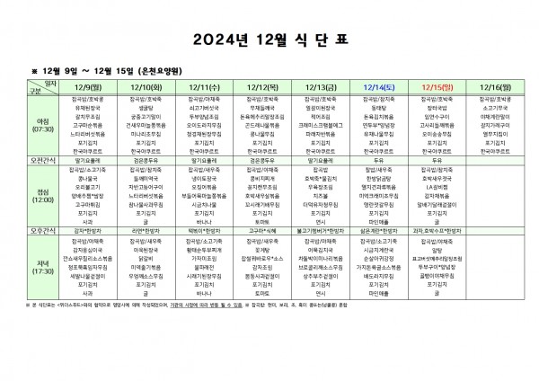 12월 둘째주 식단표 페이지 정보 작성자 은천노인복지회 작성일24-12-06 09:42 조회12,126회 댓글0건 관련링크 이전글 다음글 목록 답변 본문 . 이전글 다음글 목록 답변