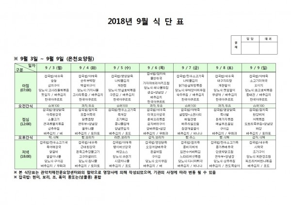 9월 첫째주 식단표 페이지 정보 작성자 은천노인복지회 작성일18-09-11 09:27 조회197,507회 댓글0건 관련링크 이전글 다음글 목록 답변 본문 9월 첫째주 식단표 이전글 다음글 목록 답변
