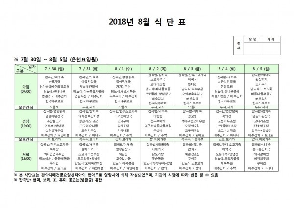 8월 첫째주 식단표 페이지 정보 작성자 은천노인복지회 작성일18-08-13 11:35 조회197,966회 댓글0건 관련링크 이전글 다음글 목록 답변 본문 8월 첫째주 식단표 이전글 다음글 목록 답변