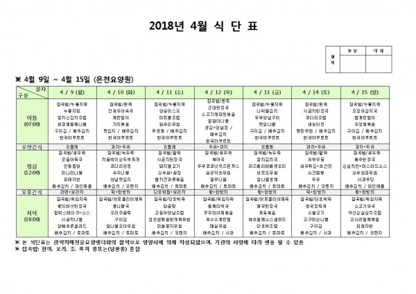 4월 둘째주 식단표 페이지 정보 작성자 은천노인복지회 작성일18-04-09 15:02 조회191,951회 댓글0건 관련링크 이전글 다음글 목록 답변 본문 4월 둘째주 식단표 이전글 다음글 목록 답변