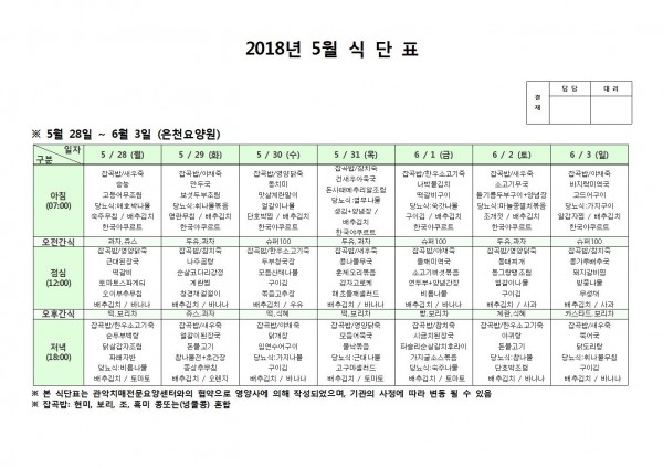 5월 다섯째주 식단표 페이지 정보 작성자 은천노인복지회 작성일18-06-07 10:39 조회197,659회 댓글0건 관련링크 이전글 다음글 목록 답변 본문 5월 다섯쨰주 식단표 이전글 다음글 목록 답변