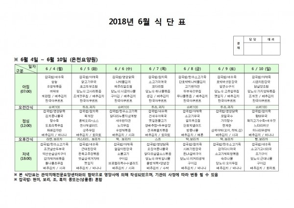 6월 둘째주 식단표 페이지 정보 작성자 은천노인복지회 작성일18-06-11 14:23 조회197,878회 댓글0건 관련링크 이전글 다음글 목록 답변 본문 6월 둘째주 식단표 이전글 다음글 목록 답변