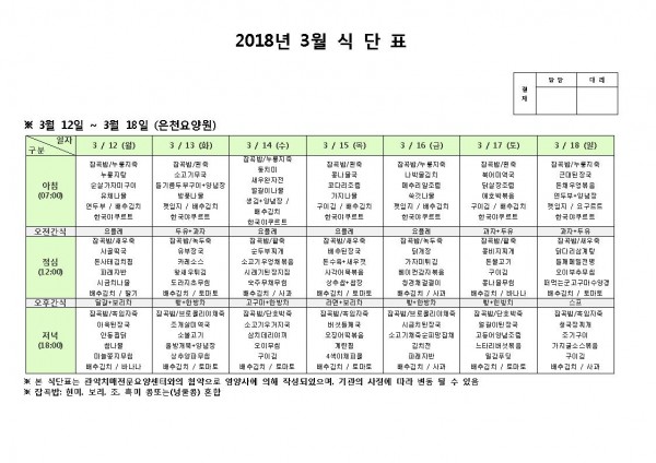 3월 셋째주 식단표 페이지 정보 작성자 은천노인복지회 작성일18-03-12 10:41 조회190,267회 댓글0건 관련링크 이전글 다음글 목록 답변 본문 3월 셋째주 식단표 이전글 다음글 목록 답변