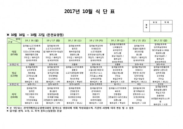 10월 셋째주 식단표 페이지 정보 작성자 은천노인복지회 작성일17-10-17 17:39 조회176,457회 댓글0건 관련링크 이전글 다음글 목록 답변 본문 10월 셋째주 식단표 이전글 다음글 목록 답변