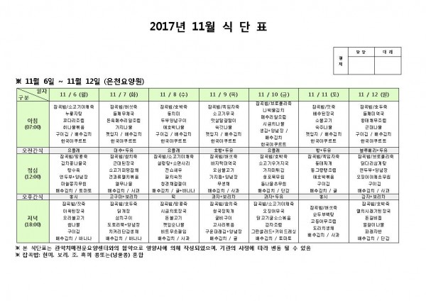 11월 둘째주 식단표 페이지 정보 작성자 은천노인복지회 작성일17-11-09 10:44 조회177,598회 댓글0건 관련링크 이전글 다음글 목록 답변 본문 11월 둘째주 식단표 이전글 다음글 목록 답변