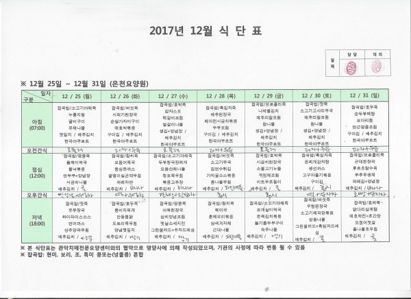 12월 다섯째주 식단표 페이지 정보 작성자 은천노인복지회 작성일17-12-26 11:49 조회183,332회 댓글0건 관련링크 이전글 다음글 목록 답변 본문 12월 다섯째주 식단표 이전글 다음글 목록 답변