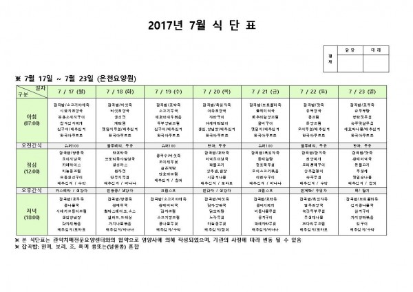 7월 셋째주 식단표 페이지 정보 작성자 은천노인복지회 작성일17-07-18 18:01 조회172,680회 댓글0건 관련링크 이전글 다음글 목록 답변 본문 7월 셋째주 식단표 이전글 다음글 목록 답변