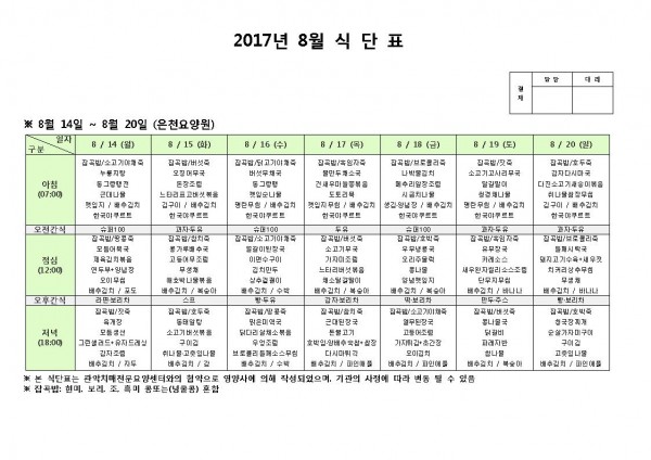 8월 셋째주 식단표 페이지 정보 작성자 은천노인복지회 작성일17-08-14 14:05 조회172,858회 댓글0건 관련링크 이전글 다음글 목록 답변 본문 8월 셋째주 식단표 이전글 다음글 목록 답변