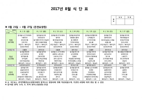 8월 넷째주 식단표 페이지 정보 작성자 은천노인복지회 작성일17-08-21 10:51 조회173,012회 댓글0건 관련링크 이전글 다음글 목록 답변 본문 8월 넷째주 식단표 이전글 다음글 목록 답변