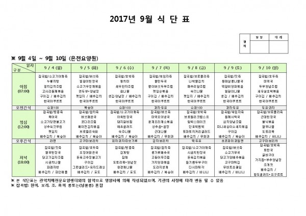 9월 첫째주 식단표 페이지 정보 작성자 은천노인복지회 작성일17-09-04 15:14 조회174,383회 댓글0건 관련링크 이전글 다음글 목록 답변 본문 9월 첫째주 식단표 이전글 다음글 목록 답변