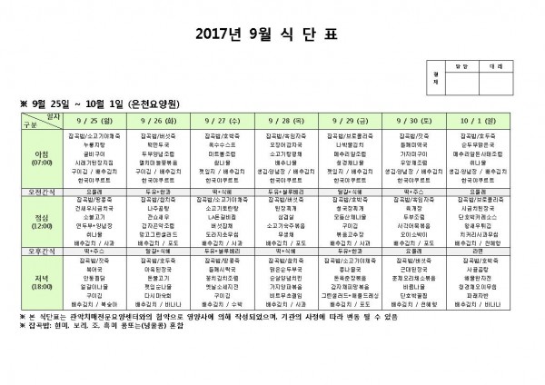 9월 넷째주 식단표 페이지 정보 작성자 은천노인복지회 작성일17-10-11 10:51 조회174,732회 댓글0건 관련링크 이전글 다음글 목록 답변 본문 9월 넷째주 식단표 이전글 다음글 목록 답변