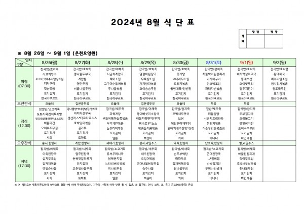 8월 다섯째주 식단표 페이지 정보 작성자 은천노인복지회 작성일24-08-23 11:34 조회15,727회 댓글0건 관련링크 이전글 다음글 목록 답변 본문 . 이전글 다음글 목록 답변