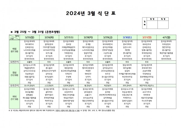 3월 다섯째주 식단표 페이지 정보 작성자 은천노인복지회 작성일24-03-22 10:02 조회21,212회 댓글0건 관련링크 이전글 다음글 목록 답변 본문 . 이전글 다음글 목록 답변