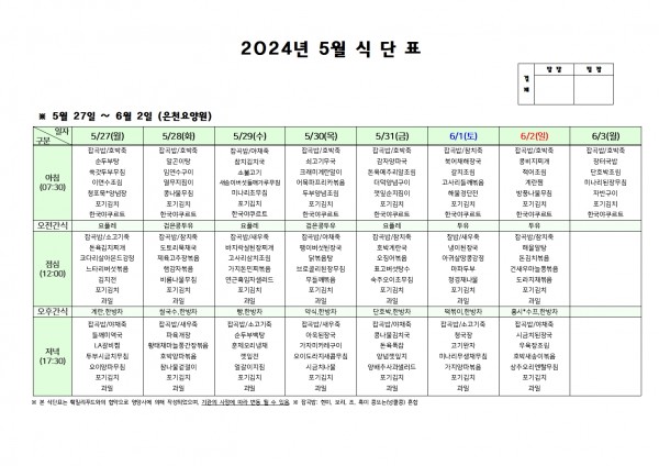 5월 다섯째주 식단표 페이지 정보 작성자 은천노인복지회 작성일24-05-24 16:18 조회19,140회 댓글0건 관련링크 이전글 다음글 목록 답변 본문 . 이전글 다음글 목록 답변