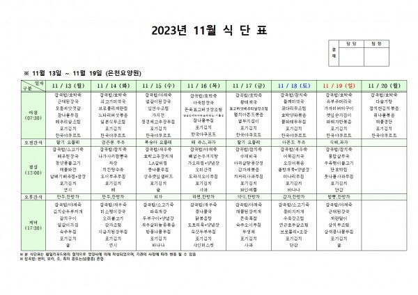 11월 셋째주 식단표 페이지 정보 작성자 은천노인복지회 작성일23-11-10 13:17 조회29,538회 댓글0건 관련링크 이전글 다음글 목록 답변 본문 . 이전글 다음글 목록 답변