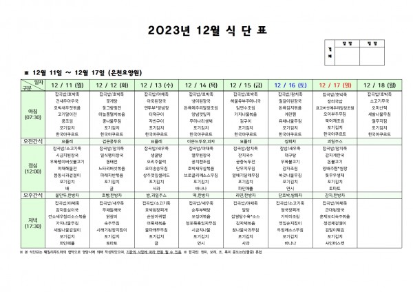 12월 셋째주 식단표 페이지 정보 작성자 은천노인복지회 작성일23-12-08 13:03 조회28,348회 댓글0건 관련링크 이전글 다음글 목록 답변 본문 . 이전글 다음글 목록 답변