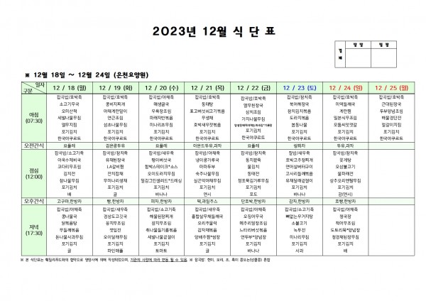 12월 넷째주 식단표 페이지 정보 작성자 은천노인복지회 작성일23-12-15 11:21 조회27,806회 댓글0건 관련링크 이전글 다음글 목록 답변 본문 . 이전글 다음글 목록 답변