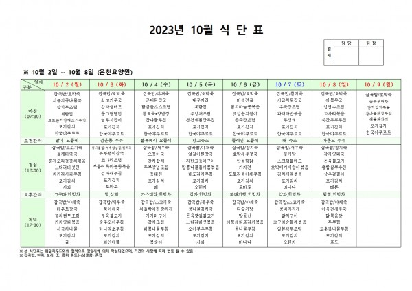 10월 첫째주 식단표 페이지 정보 작성자 은천노인복지회 작성일23-10-05 17:41 조회31,214회 댓글0건 관련링크 이전글 다음글 목록 답변 본문 . 이전글 다음글 목록 답변