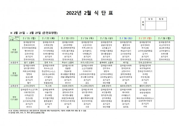 2월 넷째주 식단표 페이지 정보 작성자 은천노인복지회 작성일22-02-25 09:21 조회108,111회 댓글0건 관련링크 이전글 다음글 목록 답변 본문 . 이전글 다음글 목록 답변