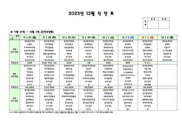 12월 첫째주 식단표 페이지 정보 작성자 은천노인복지회 작성일23-11-24 09:37 조회27,633회 댓글0건 관련링크 이전글 다음글 목록 답변 본문 . 이전글 다음글 목록 답변