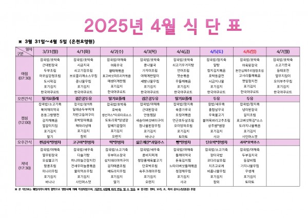 2025년 4월 첫주 식단표 페이지 정보 작성자 은천노인복지회 작성일25-03-28 10:25 조회5,400회 댓글0건 관련링크 이전글 다음글 목록 답변 본문 . 이전글 다음글 목록 답변