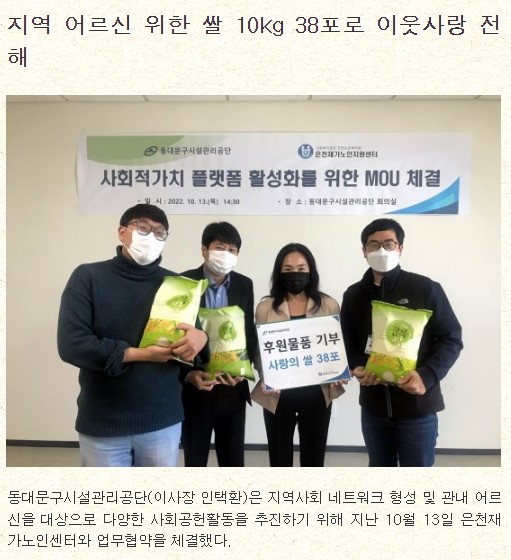 은천재가노인지원센터와 시설관리공단의 협약체결 페이지 정보 작성자 은천노인복지회 작성일22-11-09 16:58 조회7,816회 댓글0건 관련링크 https://blog.naver.com/news500/222901633880 4264회 연결 목록 답변 본문 동대문시설관리공단과 은천재가노인지원센터와 협약을 체결하였습니다앞으로 상호 협조하여 어르신의 행복한 노후를 위하여 계속 노력하겠습니다. 목록 답변