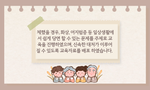 [재가노인서비스] 대상자교육_응급처치교육 페이지 정보 작성자 은천노인복지회 작성일22-03-03 11:43 조회17,407회 댓글0건 관련링크 이전글 다음글 목록 답변 본문 은천재가노인지원센터 대상자 어르신들에게 응급처치교육을 진행하였습니다. 이전글 다음글 목록 답변