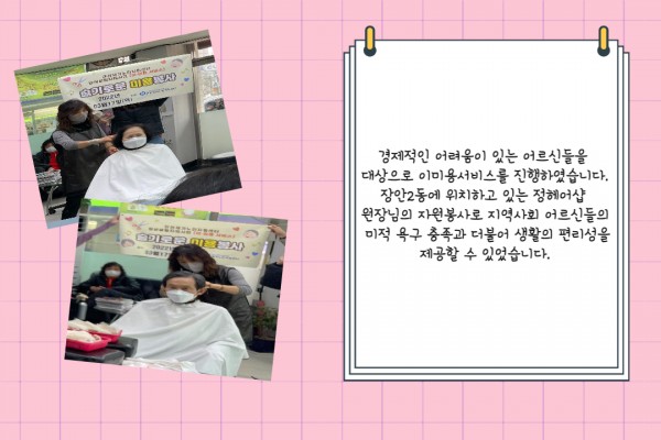 [재가노인지원서비스] 이미용 서비스 페이지 정보 작성자 은천노인복지회 작성일22-03-30 14:02 조회16,812회 댓글0건 관련링크 이전글 다음글 목록 답변 본문 3월 이미용 서비스 이전글 다음글 목록 답변