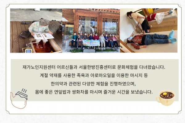 [재가노인지원] 문화공연관람서비스 '문화 힐링데이' 페이지 정보 작성자 은천노인복지회 작성일22-06-03 17:19 조회16,133회 댓글0건 관련링크 이전글 다음글 목록 답변 본문 2022년 상반기 문화활동으로 서울한방진흥센터에 다녀왔습니다. 이전글 다음글 목록 답변