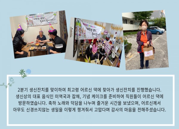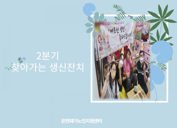[재가노인지원서비스] 2분기 찾아가는 생신잔치 페이지 정보 작성자 은천노인복지회 작성일22-07-06 13:26 조회16,212회 댓글0건 관련링크 이전글 다음글 목록 답변 본문 2분기 찾아가는 생신잔치 이전글 다음글 목록 답변