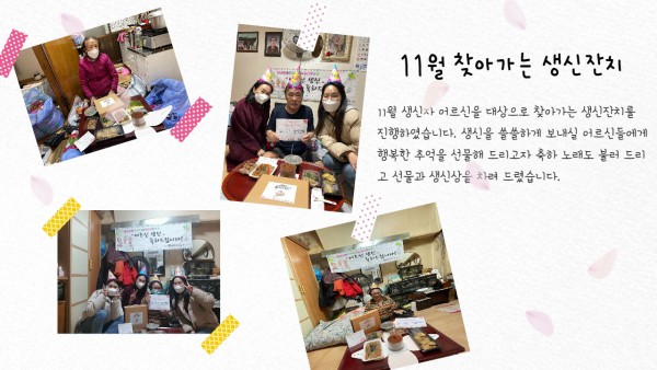 [재가노인지원서비스] 11월 찾아가는 생신잔치 페이지 정보 작성자 은천노인복지회 작성일21-12-15 17:21 조회18,259회 댓글0건 관련링크 이전글 다음글 목록 답변 본문 11월 찾아가는 생신잔치 이전글 다음글 목록 답변