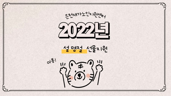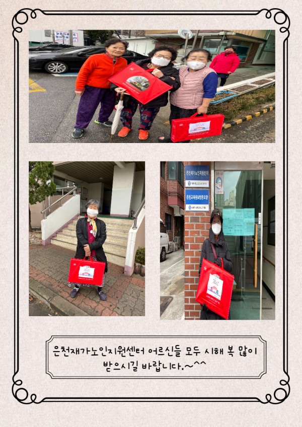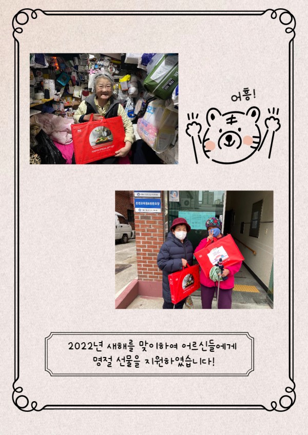 [재가노인지원서비스] 2022년 명절(설) 선물지원 페이지 정보 작성자 은천노인복지회 작성일22-02-07 15:21 조회17,560회 댓글0건 관련링크 이전글 다음글 목록 답변 본문 2022년 새해를 맞이하여 어르신들에게 선물을 지원하였습니다. 이전글 다음글 목록 답변